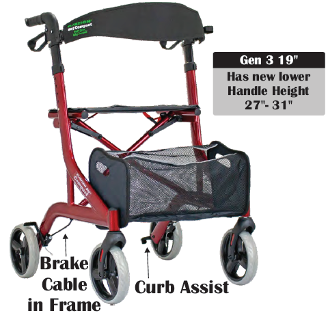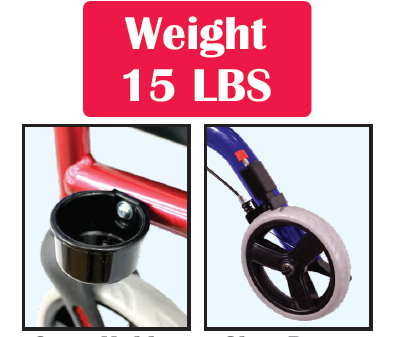 Lightweight side frame folding aluminum walker complete with 8″ casters, seat sling, folding cloth basket, extra large backrest & curb assist feature.
